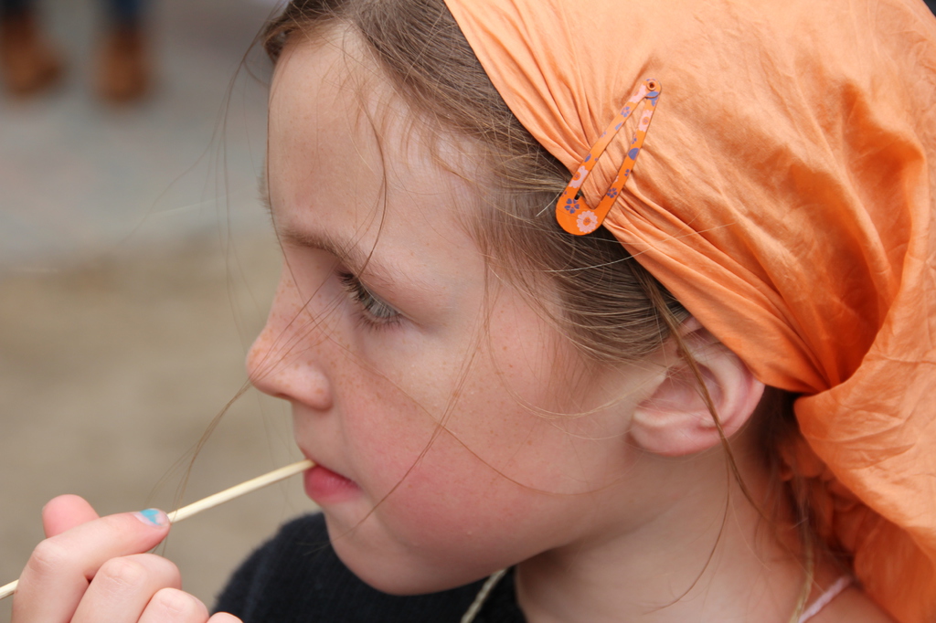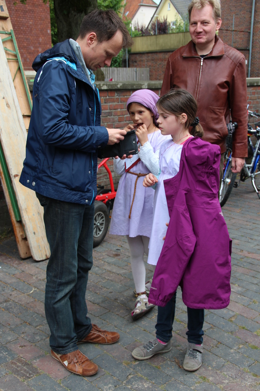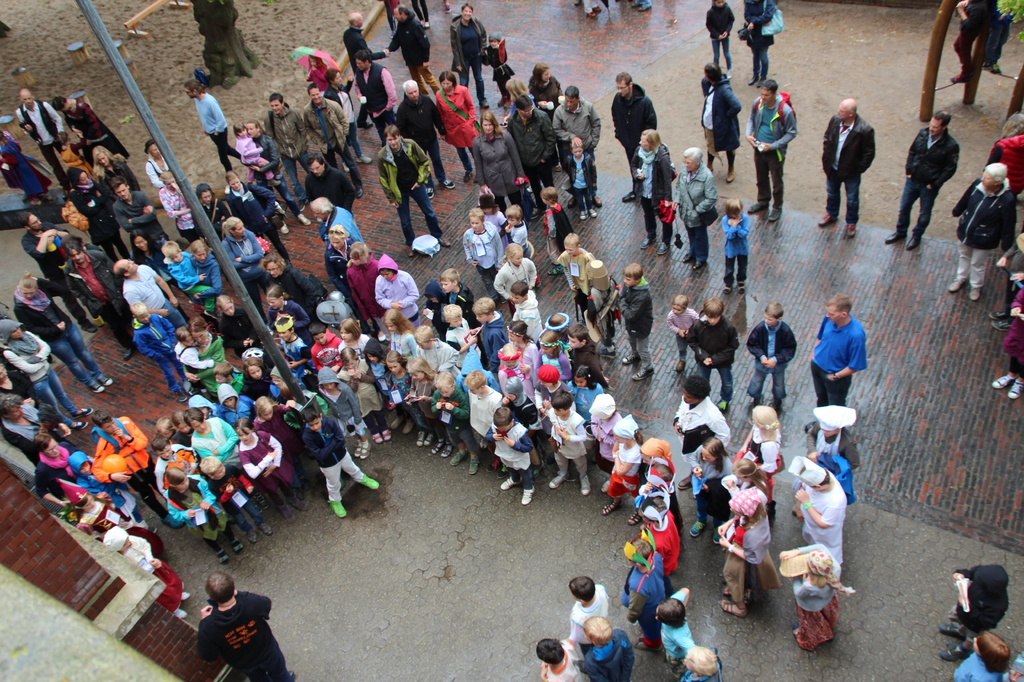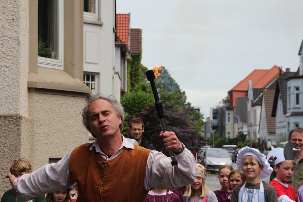 Trotz gelegentlicher Regenschauer sperrten die Röwelöwen die Straße und spuckten Feuer, rasselten mit Rüstungen, kämpften mit Keulen und Strohsäcken, tranken Met und aßen Bulgur-Gemüse aus Weißkohlblättern. Es wurde Theater gespielt, getanzt, gegaukelt und mit dem Bogen geschossen.