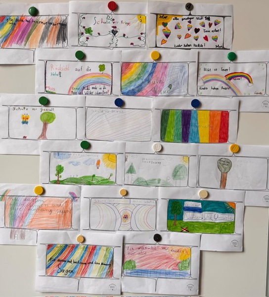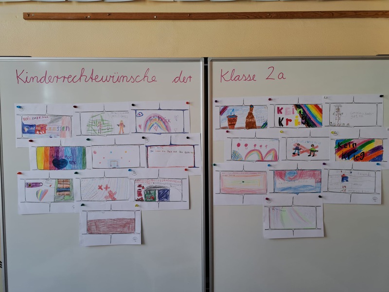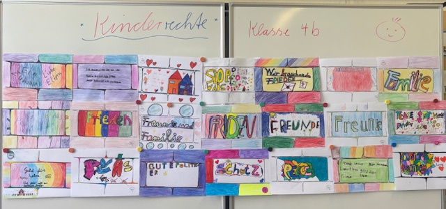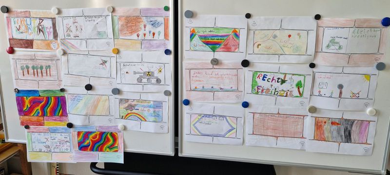 Bei unserem gemeinsamen Forum haben alle Klassen ihre Bilder zum Thema "Kinderrechte- Bausteine für Demokratie" vorgestellt. Die gestalteten Bilder wurden nach Berlin geschickt, wo am Kinderrechtetag alle Bilder als Kinderrechtemauer ausgestellt wurden. Unsere Röwelöwen haben sich sehr viel Mühe gegeben.